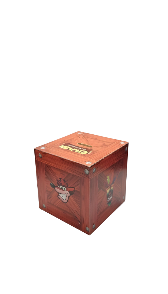 ¡Guarda tus monedas y revive la aventura! Esta alcancía de madera presenta el diseño clásico de la Caja Wumpa (o Caja de Madera) del universo Crash Bandicoot, que en el juego contiene las valiosas frutas Wumpa.