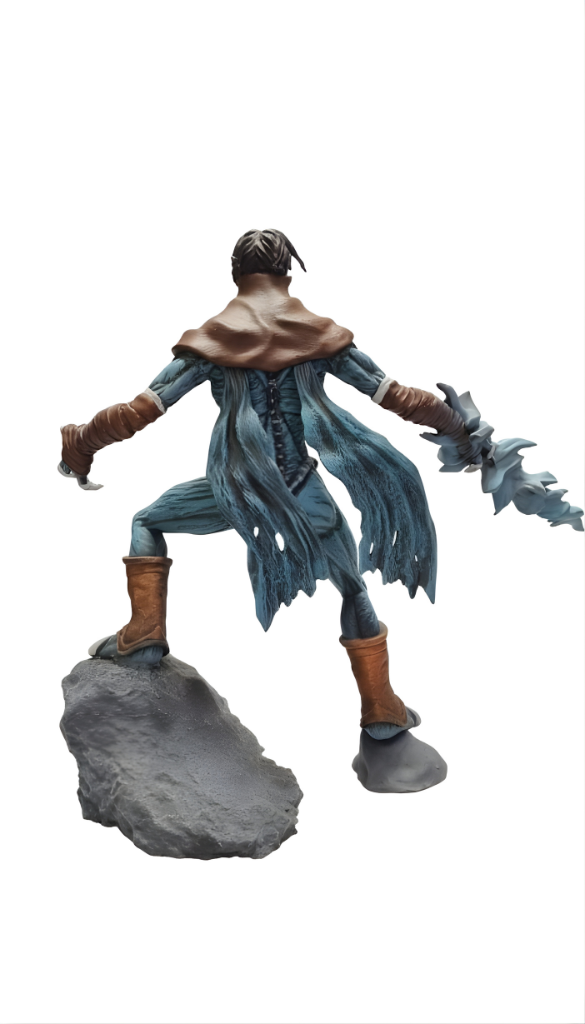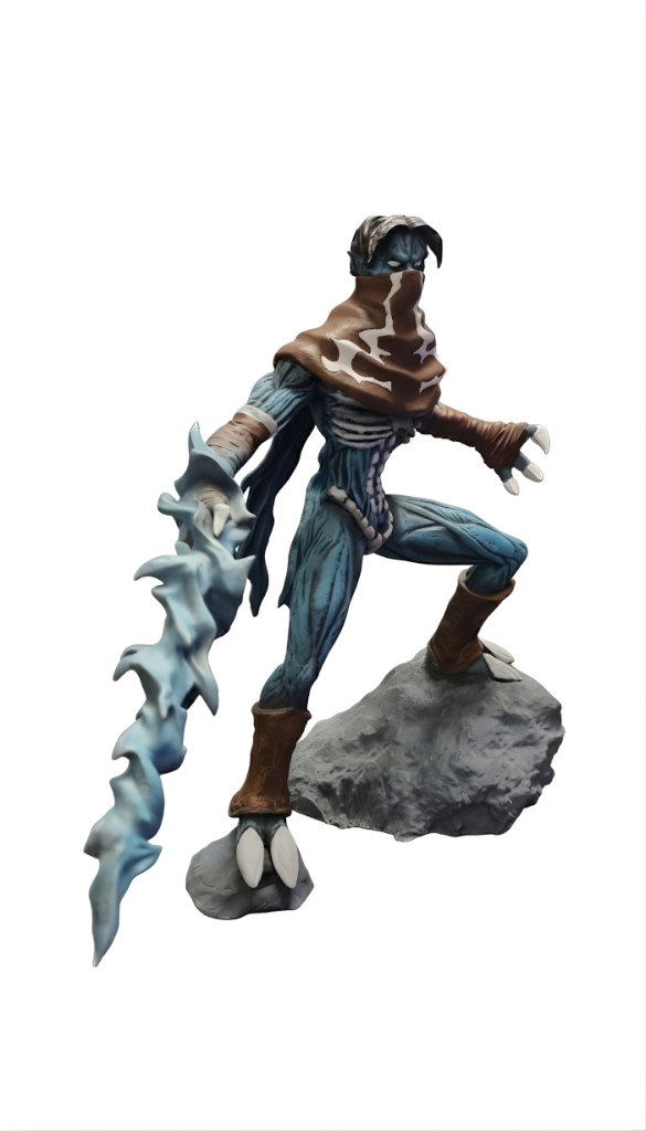 La figura destaca por sus detalles esqueléticos, su piel azul y la bufanda marrón desgarrada. Lo más notable es el Soul Reaver espectral en su brazo, la espada de energía que lo acompaña en su venganza. Es una pieza esencial para cualquier fan de los videojuegos clásicos de culto y la fantasía oscura.